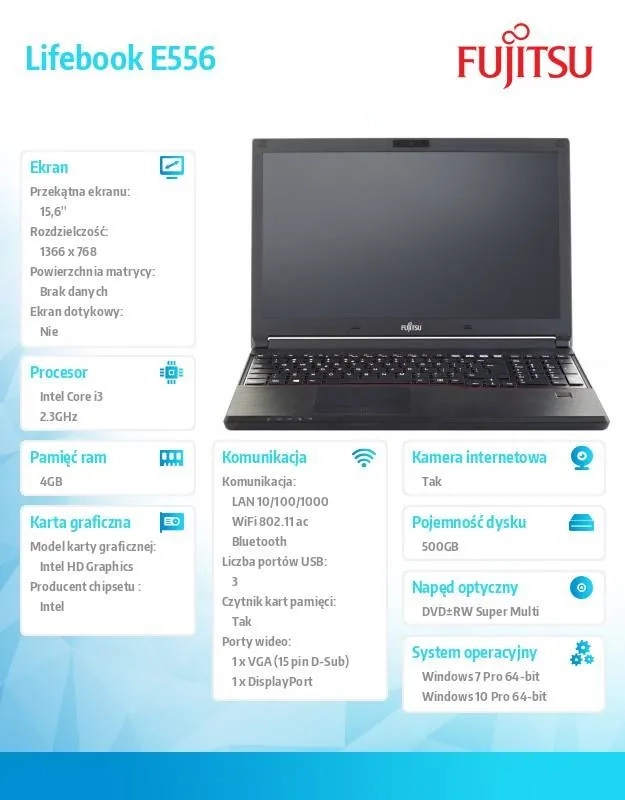 | Dodatkowe oprogramowanie | DU-DVD (Win10) LIFEBOOK/ST2015, DU-DVD (Win7) LIFEBOOK/ST2015, License Win10 Pro (Downgrade only), Load Win7Pro64 IBER-NE+Office 1mth Trial, RDVD Windows 10 Pro (64) WW, RDVD Windows 7 Pro (64) |