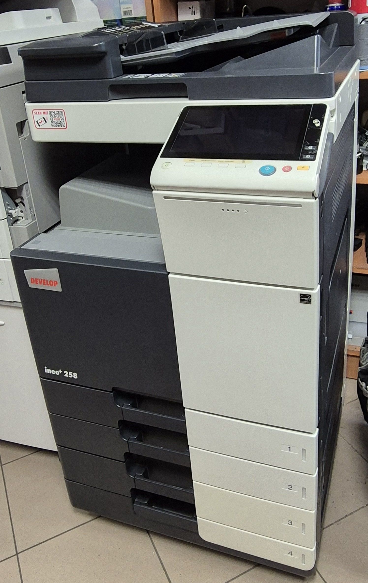 Develop ineo+ 258 to urządzenie wielofunkcyjne doskonale sprawdzające się w dużych grupach roboczych i biurach. Mniejsza waga oraz gabaryty zapewniają lepszą mobilność podczas transportu i łatwiejsze umiejscowienie urządzenia. Duży 9 calowy panel dotykowy wyróżnia się intuicyjnym rozmieszczeniem przycisków zapewniając komfort pracy i łatwość obsługi. Użytkownik może przypisać funkcje takie jak kopiowanie, skanowanie lub fax do przycisków ekranowych i tradycyjnych. Ustawienia dokonuje się w menu administratora. Obszar wspierający rozwiązania NFC (dla urządzeń z systemem Android), Bluetooth (dla urządzeń z iOS). Dużymi atutami kserokopiarki jest prędkość skanowania 160 str./min oraz kopiowanie formatu A4 w czasie 25 str/min oraz A3 w czasie 15 str/min (kolor i czarno-białe). Urządzenie w standardzie posiada 2 GB pamięci ram oraz dysk 250 GB.