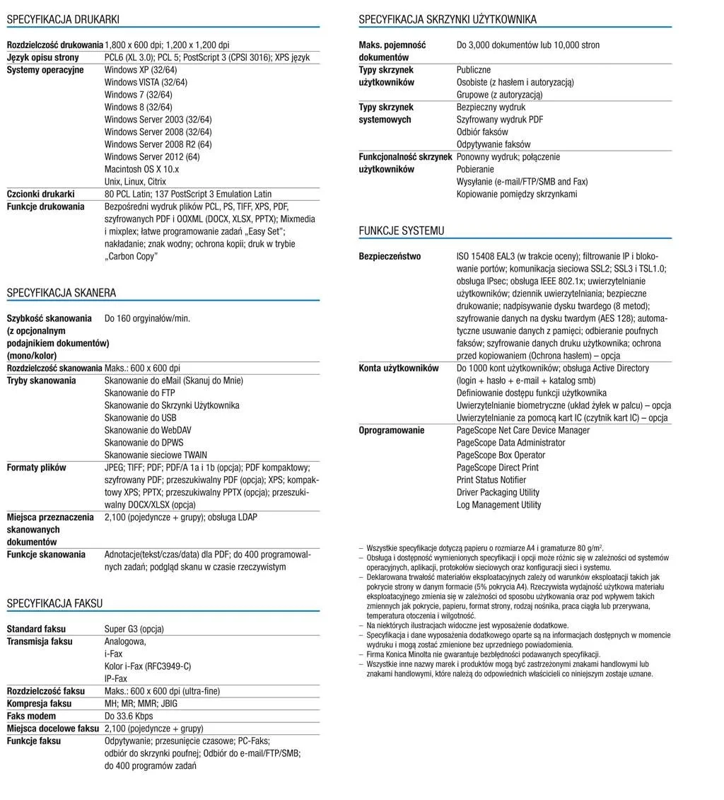 | Opcjonalnie | Store+find (opcjonalnie), convert+share (opcjonalnie), Personal Applications (opcjonalnie), Enterprise Suite (opcjonalnie), Data Administrator (konta użytkowników i kontrola kosztów), Rozwiązania dla kart zbliżeniowych (opcjonalnie), Wsparcie UNIX/Linux, Wsparcie systemu SAP, Everyone Print (opcjonalnie), PCounter (opcjonalnie) |