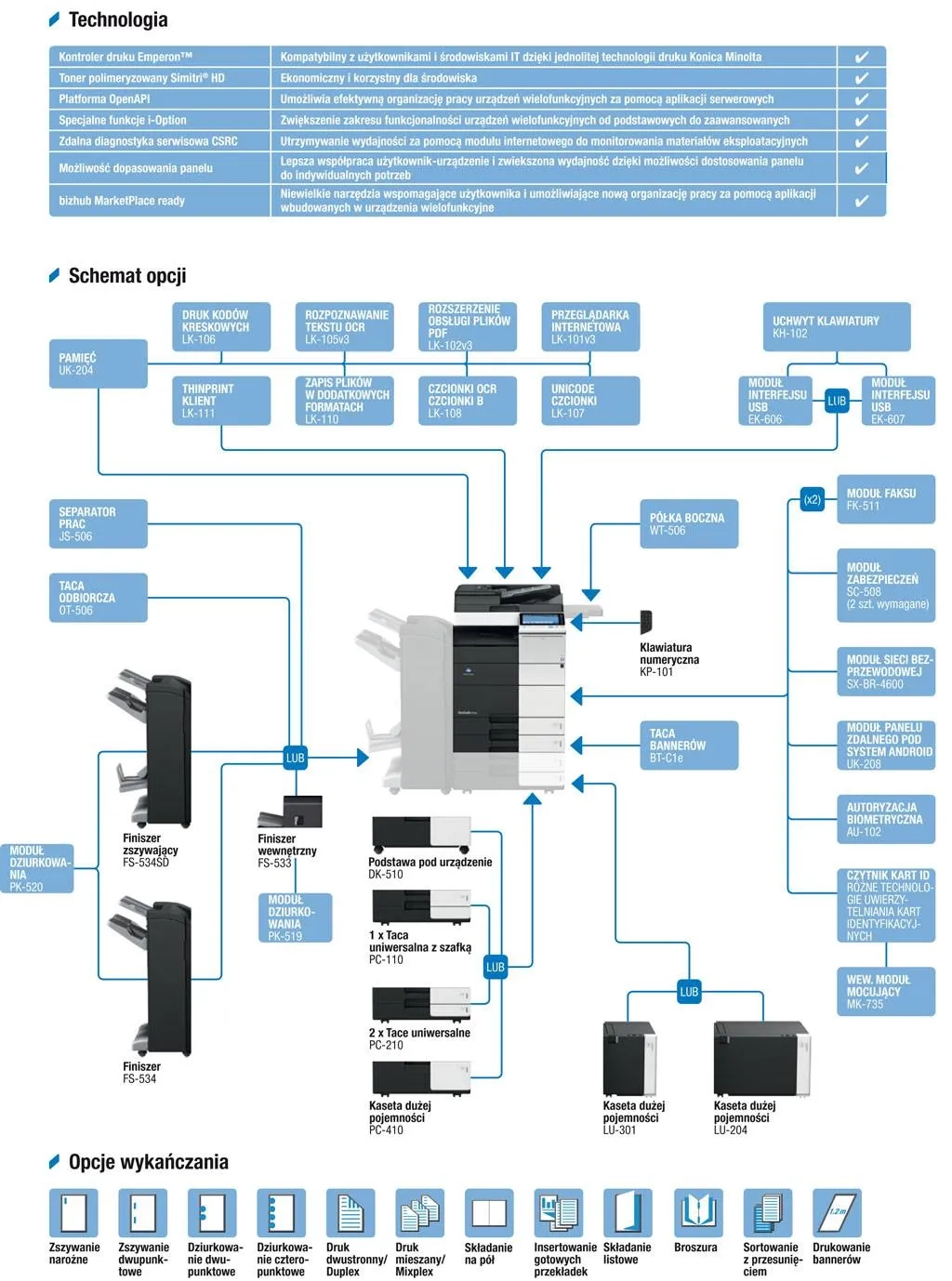 | Finiszer wbudowany (zszywanie do 50 arkuszy, taca wyjścia na 500 arkuszy, opcjonalnie moduł dziurkacza 2-4 otwory. Finiszer wolnostojący (zszywanie do 50 arkuszy, taca wyjścia na 3200 arkuszy, opcjonalnie moduł dziurkacza 2-4 otwory, moduł broszurujący (zszywanie na środku arkusza) Taca wyjścia Separator prac (max 200 – 150/50 arkuszy) Dodatkowa kaseta na 500 arkuszy Dodatkowa kaseta na 2×500 arkuszy Kaseta na 2500 arkuszy A4 Podstawa pod urządzenie Bank papieru na 3000 arkuszy, (A4, 52-256 g/m2) Bank papieru na 3000 arkuszy, (A4-SRA3, 52-256 g/m2) Podajnik na papier banerowy Moduł faksu Kontroler druku Fiery IC-414 Moduł zabezpieczający Mocowanie klawiatury Interfejs USB Interfejs USB z Bluetooth Stół roboczy Czytnik biometryczny Czytnik kart zbliżeniowych Znacznik dokumentów wychodzących i-Option (dodatkowe funkcje) Adapter WLAN |