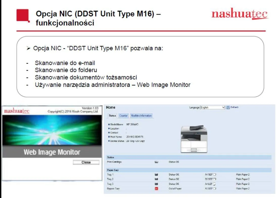 | Skanuje do (opcja) | e-mail (requirement), folder (obsługa protokołów) |