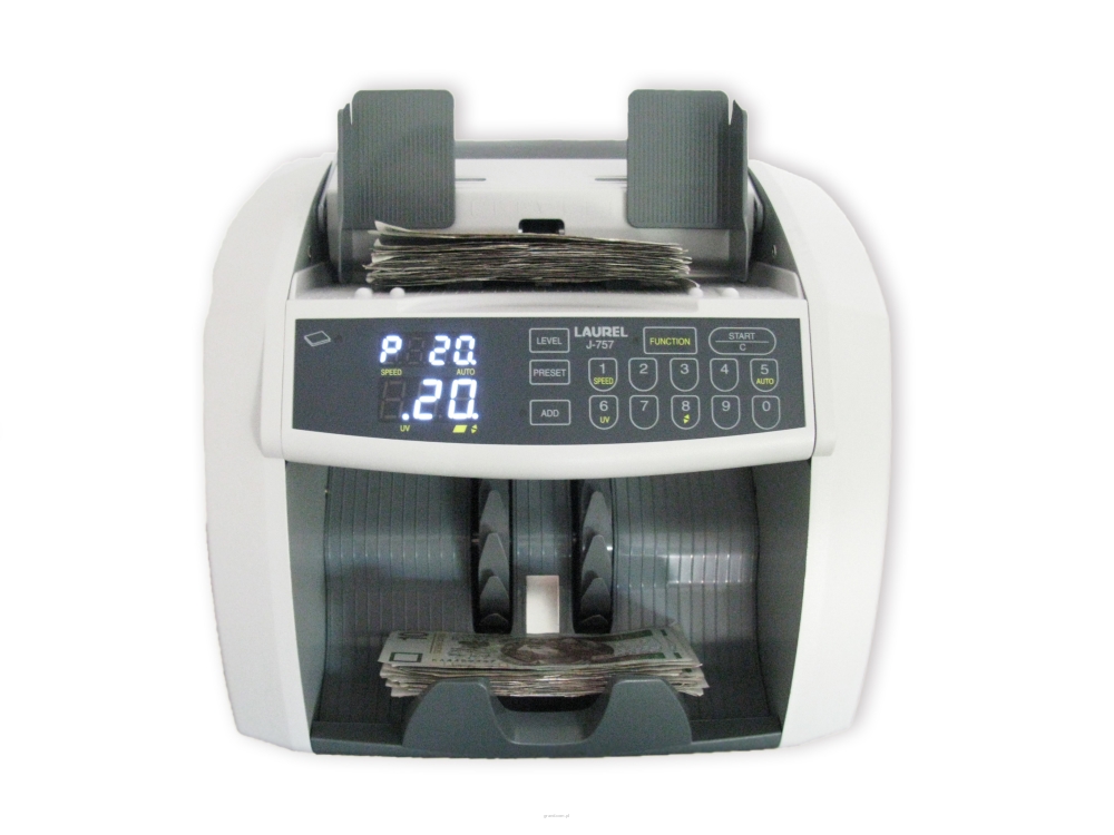 Liczarka banknotów Laurel J-757 przeznaczona do ilościowego liczenia wszystkich walut. Posiada funkcję detekcji banknotów sensorem UV oraz kontrolę rozmiaru banknotów (szerokość), która pozwala na wychwycenie w procesie liczenia banknotów uszkodzonych, podwójnych. Liczarka doskonale radzi sobie z liczeniem banknotów o zróżnicowanym stopniu zużycia.