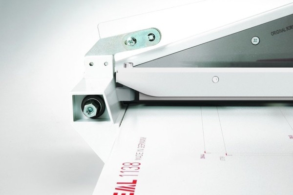 Solidna konstrukcja: Odlewany aluminiowy zawias mocujący ostrze z podwójnymi łożyskami obrotowymi na osi ostrza gwarantuje bardzo dokładne cięcie prostokątne.