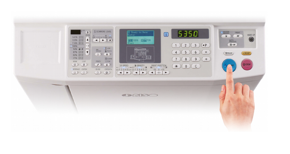 | Interfejs użytkownika | panel kontrolny LCD, komunikaty w języku polskim, informacje o aktualnym procesie pracy urządzenia (tworzenie matryc/druk), aktualnym stanie zużycia materiałów eksploatacyjnych. wbudowany interfejs komputerowy ze złączem USB 2.0 oraz RISO Network Card |