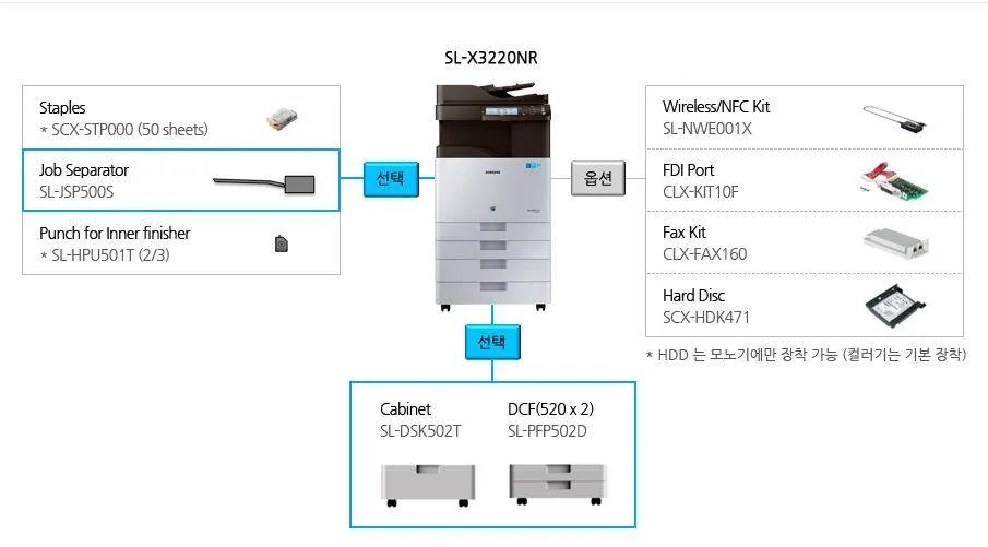 | - wewnętrzny finiszer zszywający (SL-FIN501L) - separator prac (SL-JSP500S) - stolik - stolik 2 x 520 arkuszy - moduł faksu - dysk twardy 320 GB - port FDI - zestaw bezprzewodowy / NFC - wewnętrzny finiszer zszywający dostępny wyłącznie do wersji K3300NR |